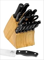 Features: 2.75" & 3.5" Parers, 4.75" Partoku, 5.5" Utility, 7" Santoku. 9" Scalloped, 8" Sharpening steel, (6) 4.5" Steak Knives. Shears, Hardwood Block. High-carbon stainless steel blades with full tang. Polymer handles provide comfort and safety when cutting. Triple compression rivets. Full Lifetime Warranty. Made in China.