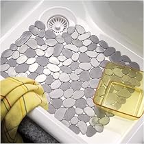 Unique pebble design. Mats can be customized for drain by cutting away pebbles. No. 60060: Clear, 10.75'' x 12.25'' No. 60063: Graphite, 10.75'' x 12.25'' No. 60660: Clear, 12'' x 15.5'' No. 60663: Graphite, 12'' x 15.5''